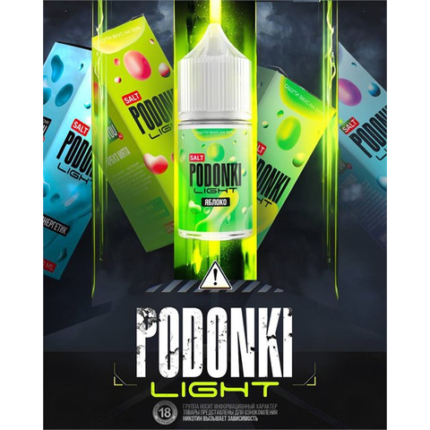 Жидкость Podonki Light 30 мл 20 мг Вкусы: Манго-маракуйя-ананас Кола вишня Черника Ягодная фрутелла Черничный йогурт Арбуз-мята Десерт клубника-лимон Лимонный мармелад с посыпкой Клубника-земляника Банан Дыня-арбуз Яблоко Энергетик Клубника-киви-мороженое