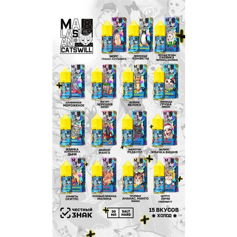 Жидкость Catswill & Malasian 30 мл 20 мг hard Вкусы: Морс гранат-клубника Лимонные конфеты Лесные ягоды, ежевика, черника, малина Лимонад груша, лимон Зелёное яблоко Йогурт черешня-банан Клубничное мороженое Жвачка земляника-дыня Двойной манго Энергетик р