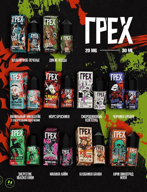 Вкусы: Клубничное печенье Дикие ягоды Черника-вишня Смородиновый коктейль Морс брусника Энергетик яблоко - киви Малина-лайм Клубника-банан Личи-виноград-мята Ванильный милкшейк с кукурузными палочками