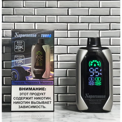 Supersense Turbo 20000 затяжек Вкусы: Персик-черника-малина Лимонная кола Клубника-банан Виноград-холодок Черника-холодок Ягодный микс Скитлс Арбуз-холодок Кислое яблоко Ежевика-вишня Апельсиновая фанта