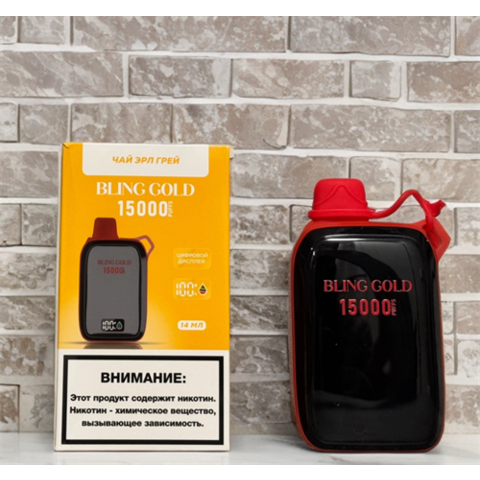 Bling Gold 15000 затяжек Вкусы: ЭРЛ ГРЕЙ Апельсин-лимон Лесные ягоды Арбуз Двойное яблоко Мятная жвачка Манго-персик-личи Яблоко-клубника-лимон Вишня-яблоко Клубника-груша-ежевика