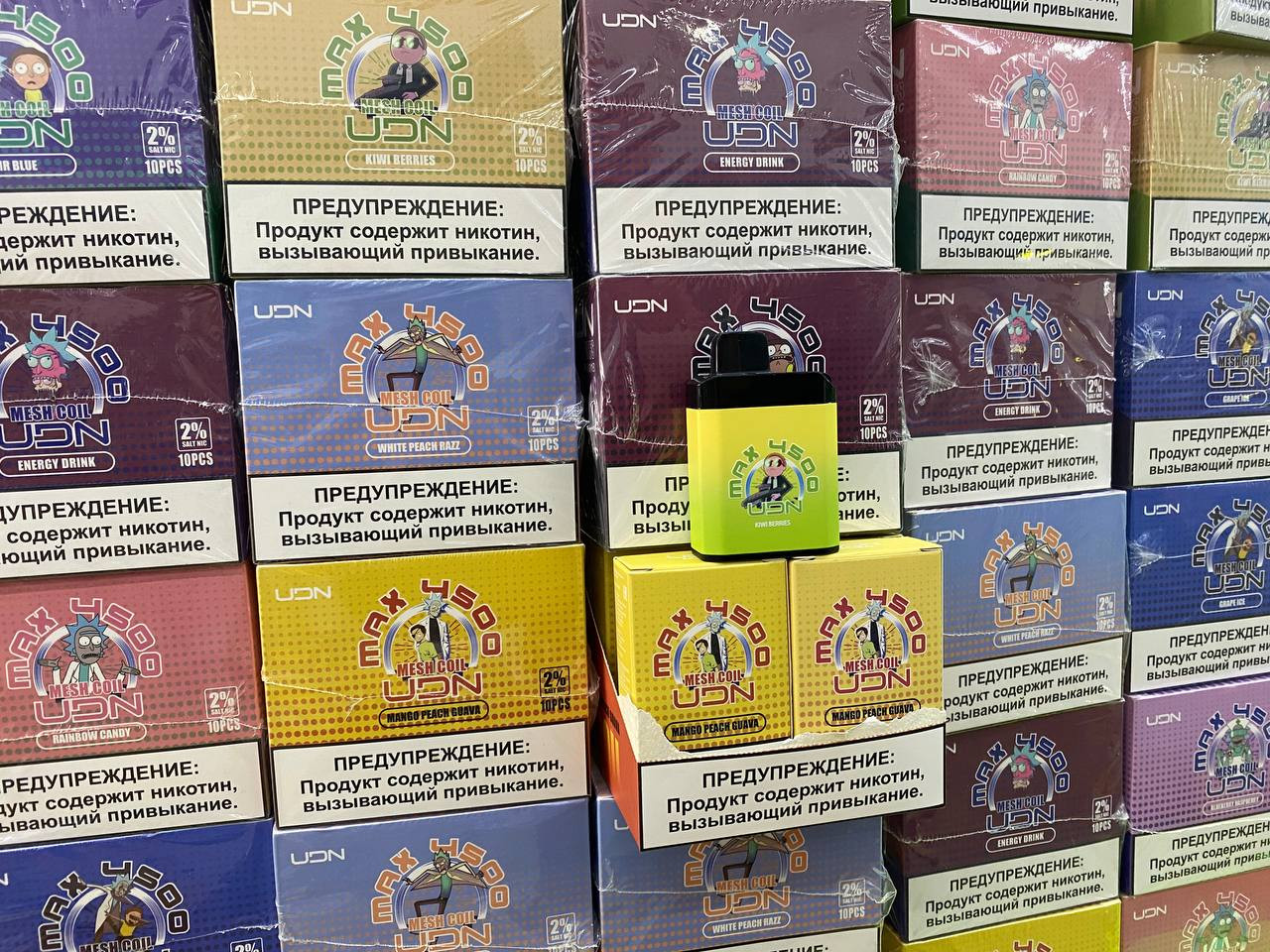 UDN MAX 4500 ЗАТЯЖЕК Вкусы 1-Grape Ice 2-Mango Peach Guava 3-Unicorn Shake 4-Kivi Berries 5-White Peach Razz 6-Energy Drink 7-Rainbow Candy 8-Blueberry Raspberry 9-MR BLUE