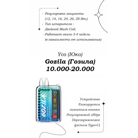 GOZILA 20000 – одноразовый вейп с запасом на 20 000 затяжек, широким выбором вкусов и стильным дизайном для комфортного парения.